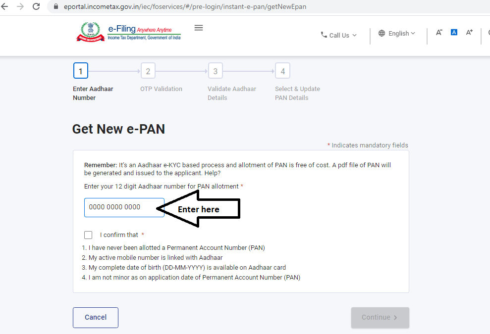 1. The applicant’s mobile number islinked to the aadhaar number and the complete date of birth is available in DD-MM-YYYY format on the aadhaar card. 2. The applicant must have a valid aadhaar card that has never been linked to a PAN number before. This instant e-PAN facility is not available to minors.