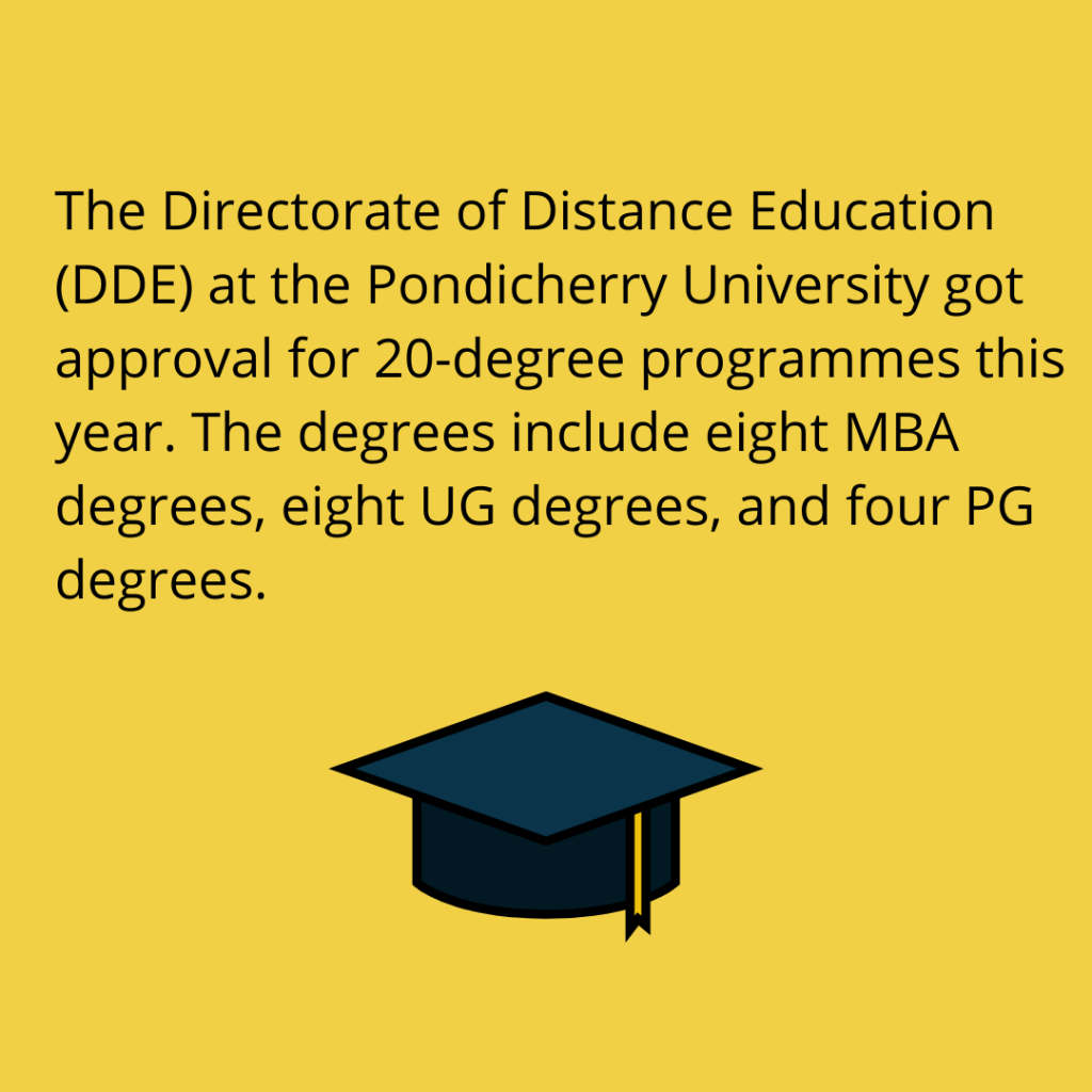 The Directorate of Distance Education (DDE) at the Pondicherry University got approval for 20-degree programmes this year. The degrees include eight MBA degrees, eight UG degrees, and four PG degrees. Those degrees are approved and recognized by the AICTE, New Delhi, and the DEB, New Delhi