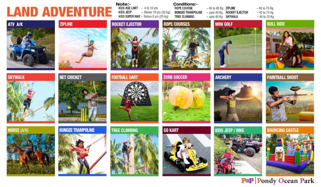 Here come the land activities like ATV rides, horse rides, and Archery. Kids enjoy the train ride, Kids jeep, Kids Bike, and Go Kart. On a Bull ride, you hold the Bull tightly to prevent you from falling. Net cricket brings back your childhood. Zipline, Bungee Trampoline, Rocket ejector, and Rope courses provide excitement not only to the participant but also to the viewers.